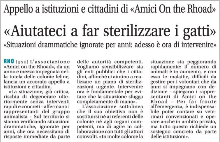 L’associazione Amici on the Rhoad lancia un appello urgente per avviare un piano di sterilizzazioni condiviso, insieme a tutti gli enti coinvolti, in modo da tutelare i gatti randagi e l’intera comunità.