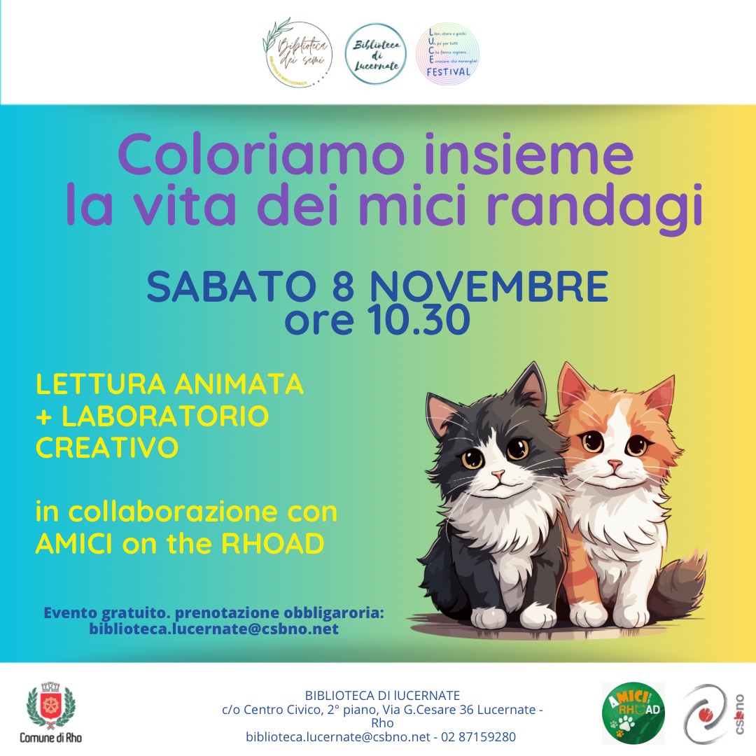 Amici on the Rhoad invita bambini, famiglie e cittadini a partecipare all’iniziativa “Coloriamo insieme la vita dei mici randagi”, un incontro dedicato alla conoscenza del mondo delle colonie feline di Rho e al benessere dei gatti randagi del territorio. L’appuntamento si terrà sabato 8 novembre presso la Biblioteca di Lucernate, all’interno del Centro Civico di Via Giulio Cesare 36 a Lucernate (Rho), con inizio alle ore 10:30.