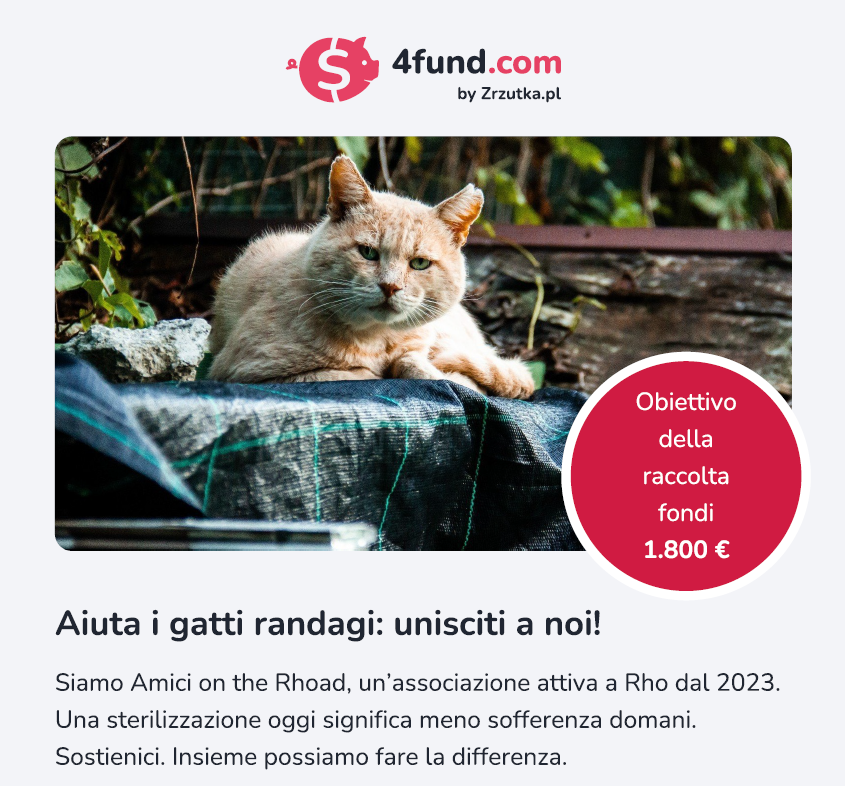 Come Amici on the Rhoad, abbiamo avviato una raccolta fondi con un obiettivo concreto: raccogliere 1.800 euro per sterilizzare circa 10 gatti randagi della città di Rho.